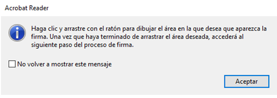 Al pinchar ahí nos aparece el siguiente mensaje indicándonos que dibujemos un área (un rectángulo) donde queremos que aparezca la firma digital.
