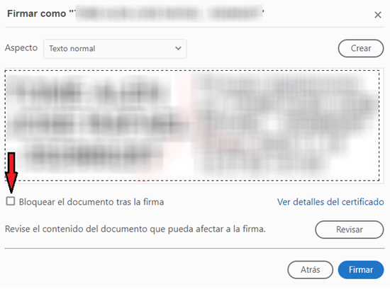 Nos permite seleccionar la opción de bloquear el documento una vez firmado.